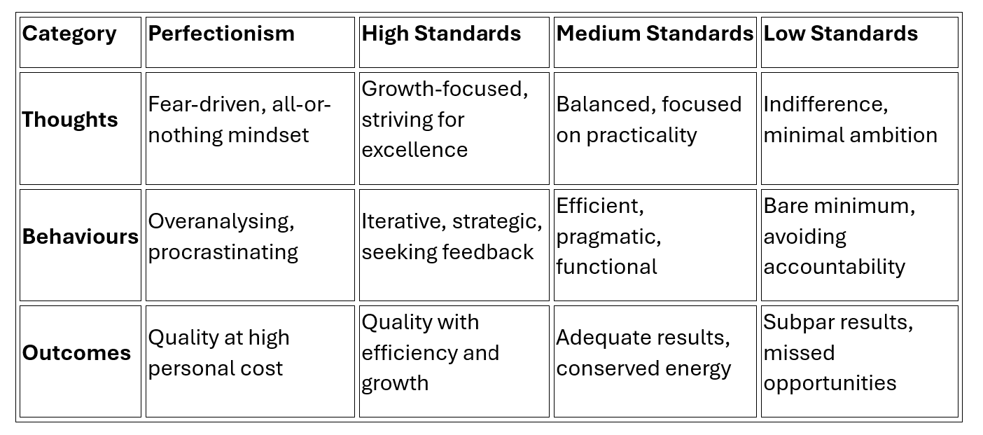 Recognising where you fall on the spectrum of standards for different tasks and situations can help you strike the right balance between quality, efficiency, and personal satisfaction. Adjusting your approach based on the context allows you to achieve meaningful results without undue mental hardship or unproductive effort.